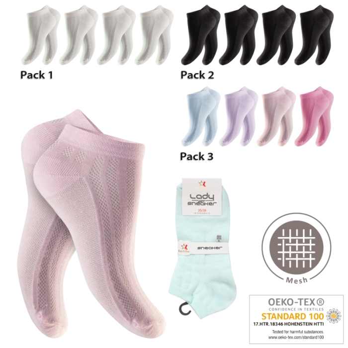 Na nošení velmi příjemné dámské kotníkové ponožky s vysokým podílem bavlny. Velmi pohodlné na nošení a příjmené na omak. Díky obsahu elastanu se výborně přizpůsobí tvaru chodidla v dané velikosti. Piqué lem přispívá k pohodlnému nošení bez zařezávání a otlaků na chodidle. Díky vložkám ze síťoviny jsou prodyšné a dobře regulují klima v oblasti chodidla.