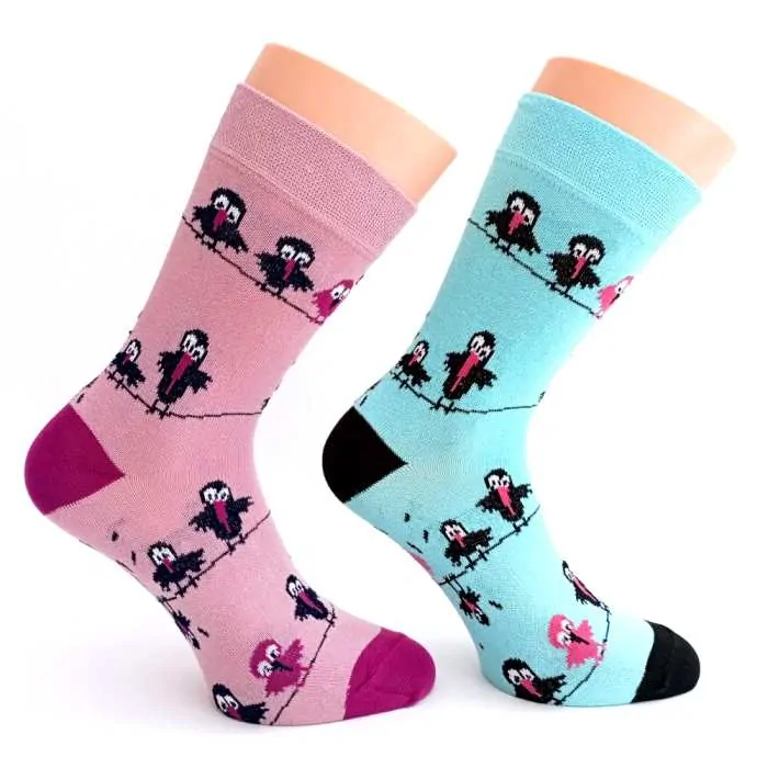 Dámské ponožky s vysokým podílem bavlny s bláznivými vránami na drátě. Nápaditý kousek do šatníku každého milovníka ptactva. Probuďte v sobě hravou duši bez ohledu na věk!