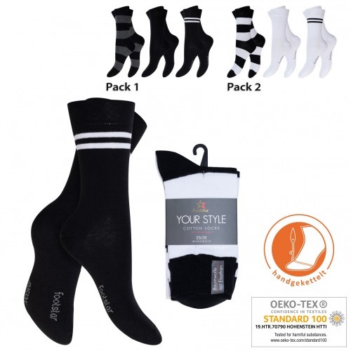 Dámské ponožky s vysokým podílem bavlny mají pro vaše pohodlí komfortní piqué lem a jemný, ručně řetízkovaný šev na špičce. Ponožky tak nezpůsobují otlaky na lýtku a netlačí v oblasti prstů. Díky obsaženému elastanu se výborně přizpůsobí tvaru chodila, takže se ponožky nepřetáčí a nestahují se. Pro větší pohodlí a delší životnost mají ponožky zesílenou patu a špičku.