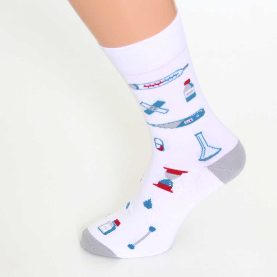 Barevné dámské a pánské ponožky v bílém provedení s lékařskými motivy pro lékaře, záchranáře, lékárníky, mediky, sestřičky a zdravotníky.