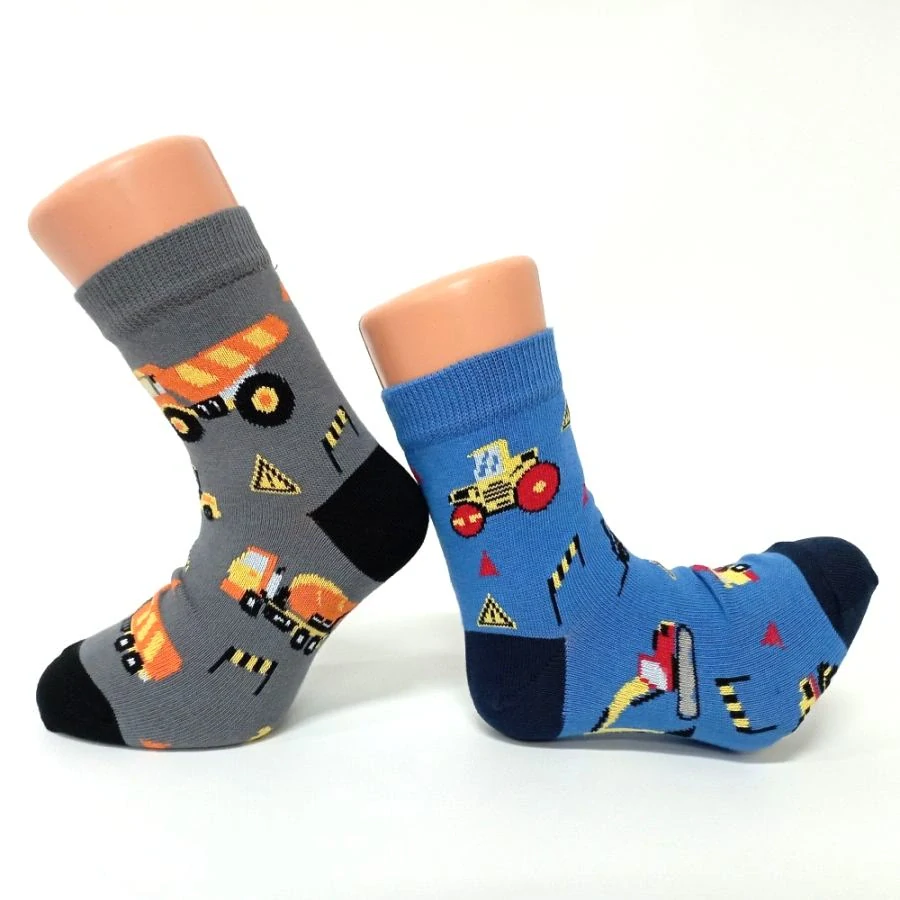Veselé klučičí ponožky s obrázky stavební techniky. Je libo bagr, domíchávač, válec, nákladní auto, vysokozdvižný vozík?