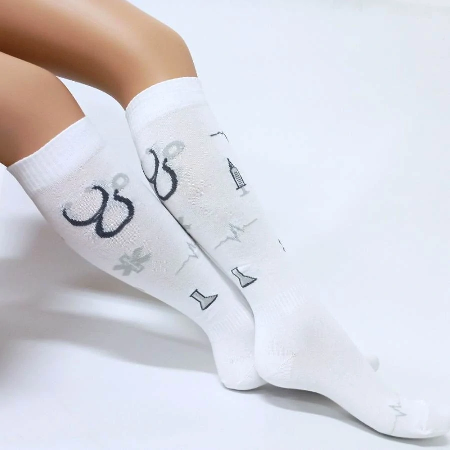 Bílé bavlněné podkolenky s drobnými lékařskými motivy nejen pro lékařky, záchranářky, lékárnice, medičky, sestřičky a zdravotnice.
