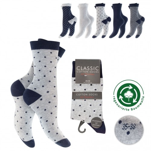 Velmi pohodlné dámské ponožky s motivy proužků, puntíků a s barevnou špičkou a patou v praktickém balení pěti párů. Ponožky mají jemný lem a extra plochý šev ve špičce, který netlačí na prsty u chodidla. Vpletený žebrovaný pásek přispívá k optimálnímu držení ponožky na chodidle. Díky obsahu elastanu se ponožky výborně přizpůsobí tvaru chodila a neshrnují se. Ponožky jsou velmi pohodlné a vhodné na běžné nošení a vysoký obsah bavlny zajišťuje příjemný kontakt ponožky s pokožkou chodidla.