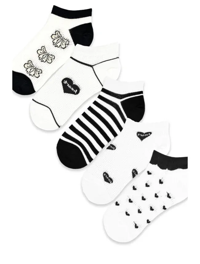 Balení pěti párů dámských kotníkových ponožek v bílém provedení s kontrastními jemnými vzory.