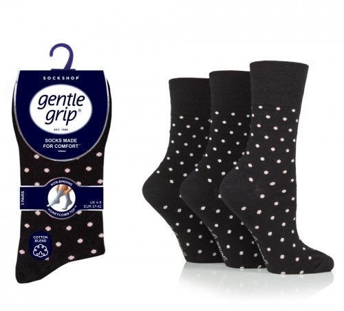 Bavlněné dámské ponožky s jemným lemem Gentle Grip v černém provedení se světlými puntíky. Kupte si je pro jejich pohodlí a noste pro vaši zábavu.