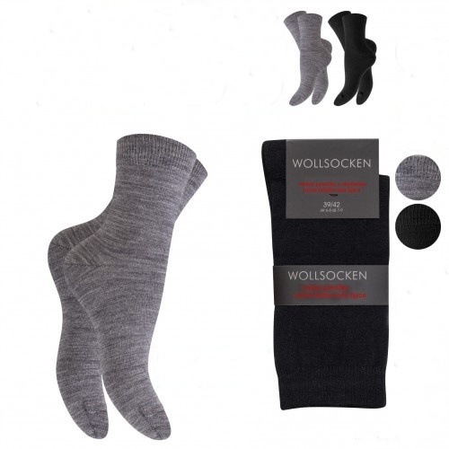 Balení tří párů luxusních vlněných dámských ponožek v černém nebo šedém provedení. Jemný úplet a použitá kvalitní vlna je velmi příjemná na nošení, ručně řetízkovaná špice a pohodlný lem příspívají k vysokému komfortu při nošení.
