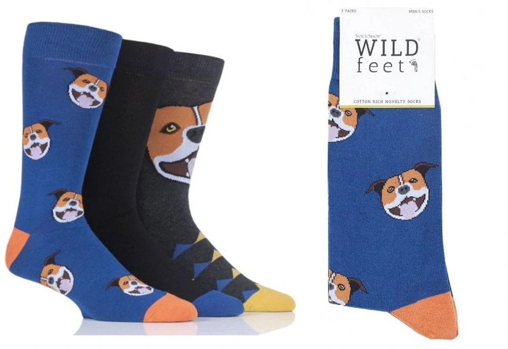 3 páry pánských vzorovaných a veselých ponožky WILD feet s veselým Stafordem - pozornost 100% zaručena! V balení jsou tři milé a zábavné vzory. Každá ze tří ponožek v balení má jedinečný vzhled, individuální design a skvělou kvalitu. Ponožky jsou upletené ve standartní pánské velikosti z měkké směsi bohaté na kvalitní bavlnu. Ponožky jsou jemné a velmi příjemné na dotyk. Pro vaše pohodlí mají ploché, ručně řetízkované hladké švy na špičce a lem který nezpůsobuje otlaky. Díky přidanému elastanu se výborně přizpůsobí chodidlu v rozmezí velikosti 40 až 46 EUR.