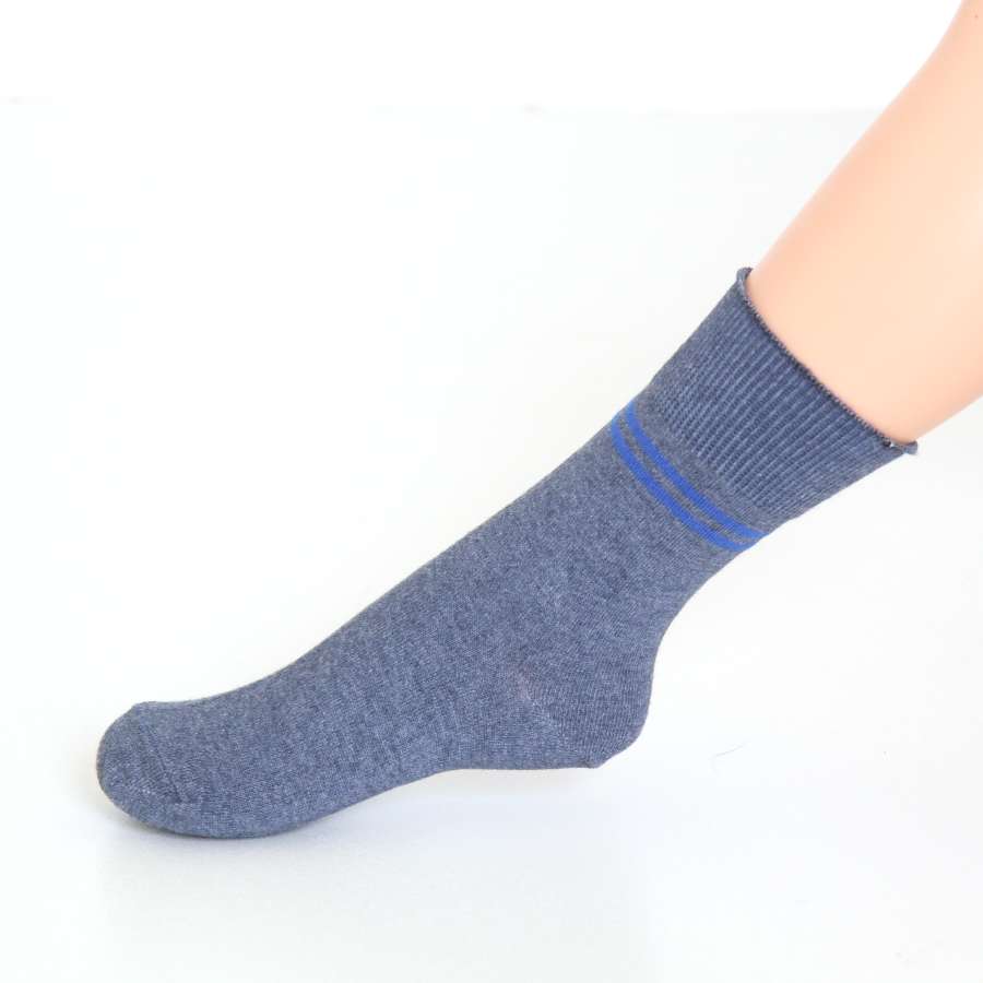 Bavlněné dětské ponožky s hladkým elastickým úpletem a jemným žebrovaným lemem. Ponožky jsou velmi příjemné na dotek a žebrovaný úplet nezpůsobuje otlaky. Elastický úplet se výborně přizpůsobuje tvaru chodidla a dobře drží ponožku na dětské nožičce. Ponožky jsou v jednobarevném jeansovém provedení s jemným proužkem v oblasti kotníku.