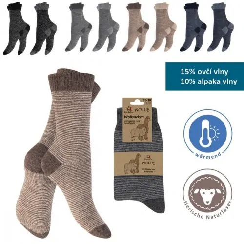 Vlněné dámské termo ponožky s jemnými proužky v přírodních odstínech pletené z akrylové příze s příměsí vlny alpaka a ovčí vlny. Ponožky jsou velmi jemné na omak a zároveň hodně hřejí. Pro vaše pohodlí mají komfortní žebrovaný lem, který nezpůsobuje nežádoucí otlaky. Huňatý materiál úpletu je příjemně jemný a přispívá k hřejivému pocitu při nošení.