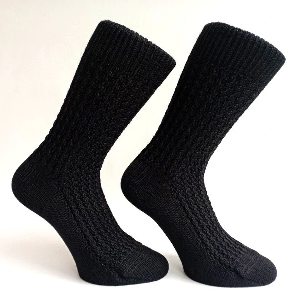 Tyto černé vlněné ponožky jsou navrženy pro maximální tepelný komfort a pohodlí. Jsou upleteny z vysoce kvalitní jemné vlny, která skvěle izoluje teplo a udržuje nohy v suchu a dodává pocit tepla i během chladných a sychravých dní. Spoj špice je sešitý velmi jemným švem, což zajišťuje hladký a neznatelný spoj, který netlačí na prsty.